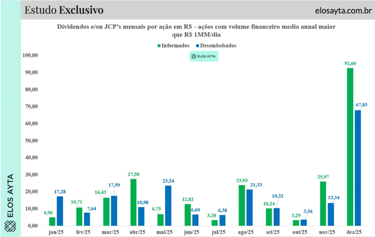 Essa dinâmica explica por que os volumes anunciados em determinado mês não se convertem integralmente em desembolsos no mesmo período. Apesar do anúncio de um pagamento elevado, parte relevante dos proventos informados em dezembro ainda será quitada nos próximos meses.