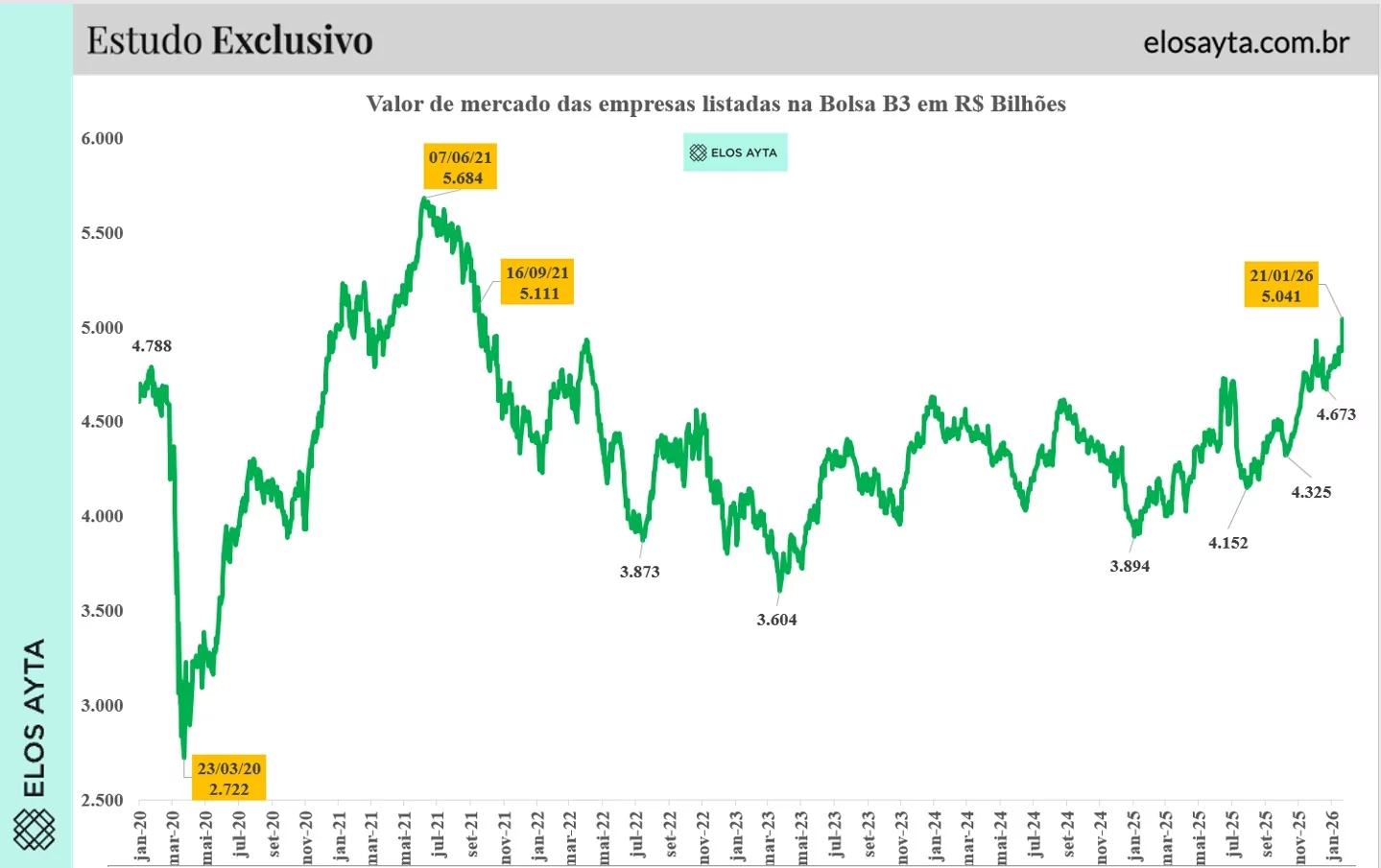 O número chama atenção, mas o movimento ganha real dimensão quando observado fora da lente do curto prazo. No mesmo pregão, o valor de mercado total das empresas listadas na B3 voltou a superar R$ 5 trilhões, patamar que não era visto desde 27 de setembro de 2021, quando o mercado brasileiro ainda surfava os efeitos combinados da recuperação pós-pandemia e de uma intensa onda de IPOs.