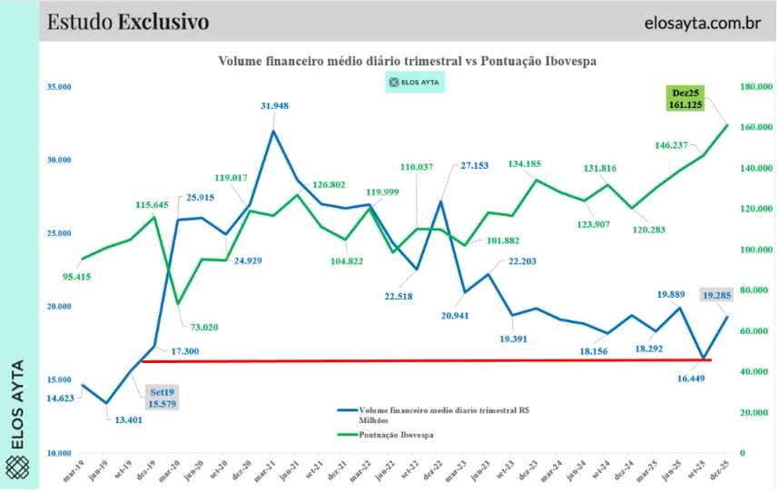 De acordo com levantamento da Elos Ayta, o volume financeiro médio diário do mercado à vista no terceiro trimestre de 2025 foi de R$ 16,44 bilhões por dia, o menor nível desde o terceiro trimestre de 2019 (R$ 15,57 bilhões).