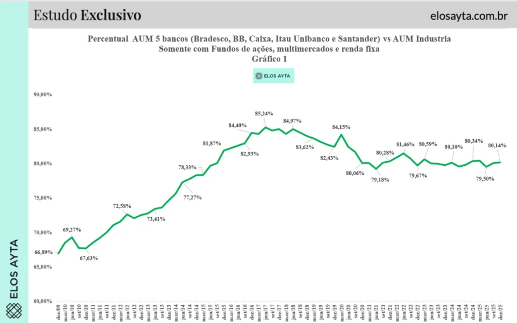 O efeito aparece no gráfico. A indústria de fundos continua crescendo, mas o crescimento deixa de ser apropriado quase integralmente pelos cinco grandes bancos. Gestoras independentes ganham escala. Plataformas ampliam participação. A concentração permanece alta, mas sua trajetória ascendente é interrompida. Há desconcentração relativa.