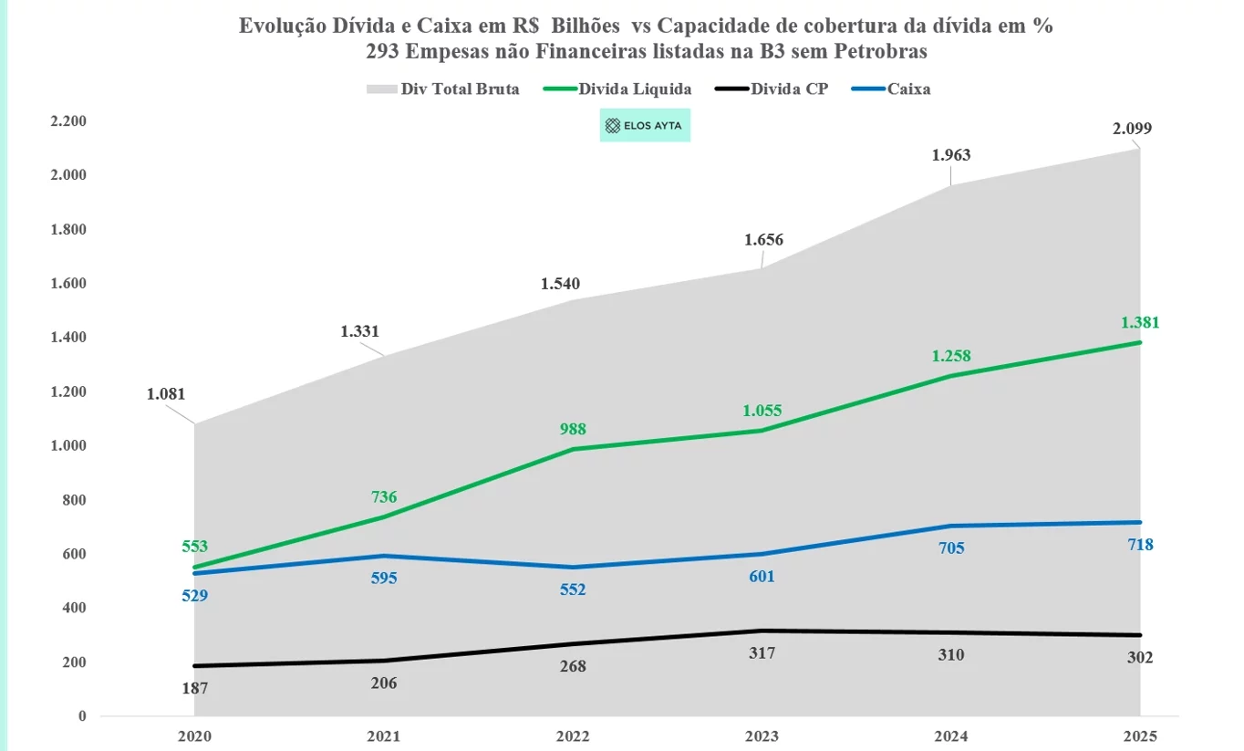 O endividamento das empresas brasileiras voltou ao centro do debate, mas não pelos motivos tradicionais. Em 2025, as companhias não financeiras listadas na B3 encerraram o ano com R$ 2,09 trilhões em dívida bruta, praticamente o dobro do registrado em 2020, quando o estoque era de R$ 1,08 trilhão no auge da pandemia.