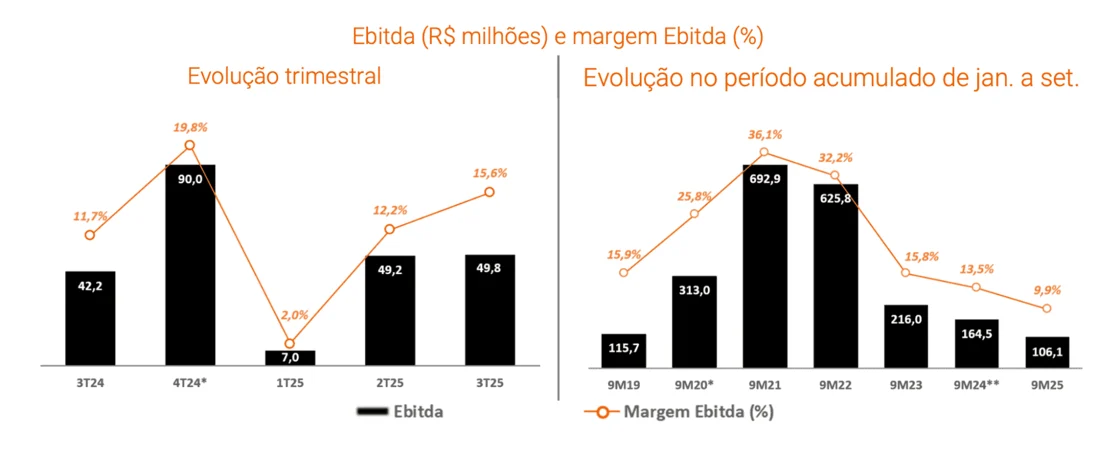 Embora a receita tenha recuado um pouco menos do que as vendas no período (-53%), o impacto foi apenas parcialmente compensado por um preço médio de venda mais elevado. Ao mesmo tempo, os custos caíram em ritmo menor (-33%) e as despesas operacionais avançaram 19%, o que levou a uma queda expressiva de 85% no Ebitda (lucro antes de juros, depreciação, amortização e impostos).