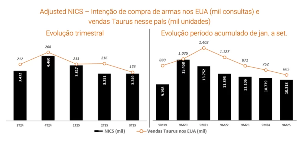 Nos Estados Unidos, principal mercado consumidor dos produtos da Taurus, tanto a intenção de compra de armas quanto as vendas da companhia passaram a recuar a partir de 2021, após o impulso observado durante o período eleitoral norte-americano. Esse movimento se estende nos anos seguintes, ainda que com oscilações pontuais entre os trimestres.