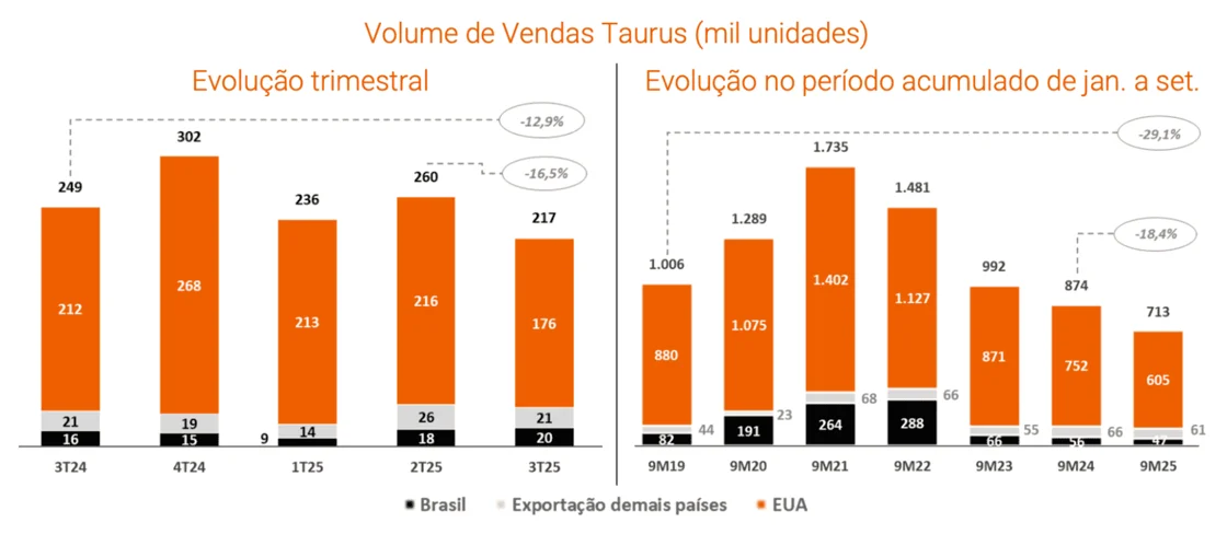 No Brasil, o cenário é ainda mais desafiador. As vendas domésticas — que chegaram a representar cerca de 20% da receita total da companhia — foram praticamente paralisadas após a mudança de governo em 2023, com o endurecimento das regras para aquisição, registro, posse e porte de armas. Como resultado, o volume consolidado de vendas da Taurus caiu quase 60% desde 2021.