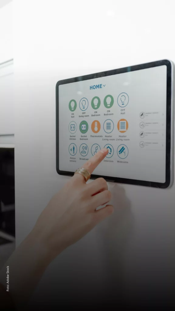 Interruptores inteligentes permitem programar o tempo de funcionamento das luzes de acordo com a rotina da casa. Dessa forma, evitam-se situações comuns, como esquecer uma lâmpada acesa.